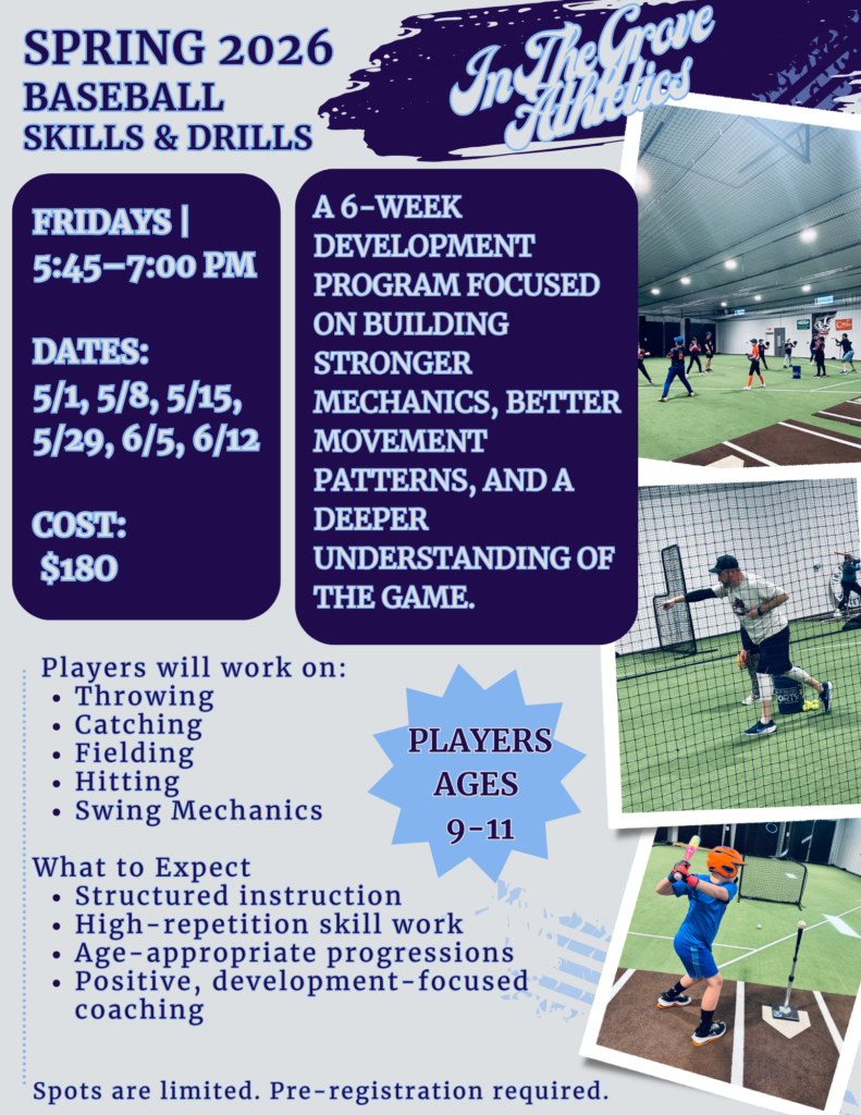 A 6-week development program for players ages 9–11 focused on strengthening mechanics, movement patterns, and overall understanding of the game. Sessions will cover throwing, catching, fielding, hitting, and swing mechanics.
