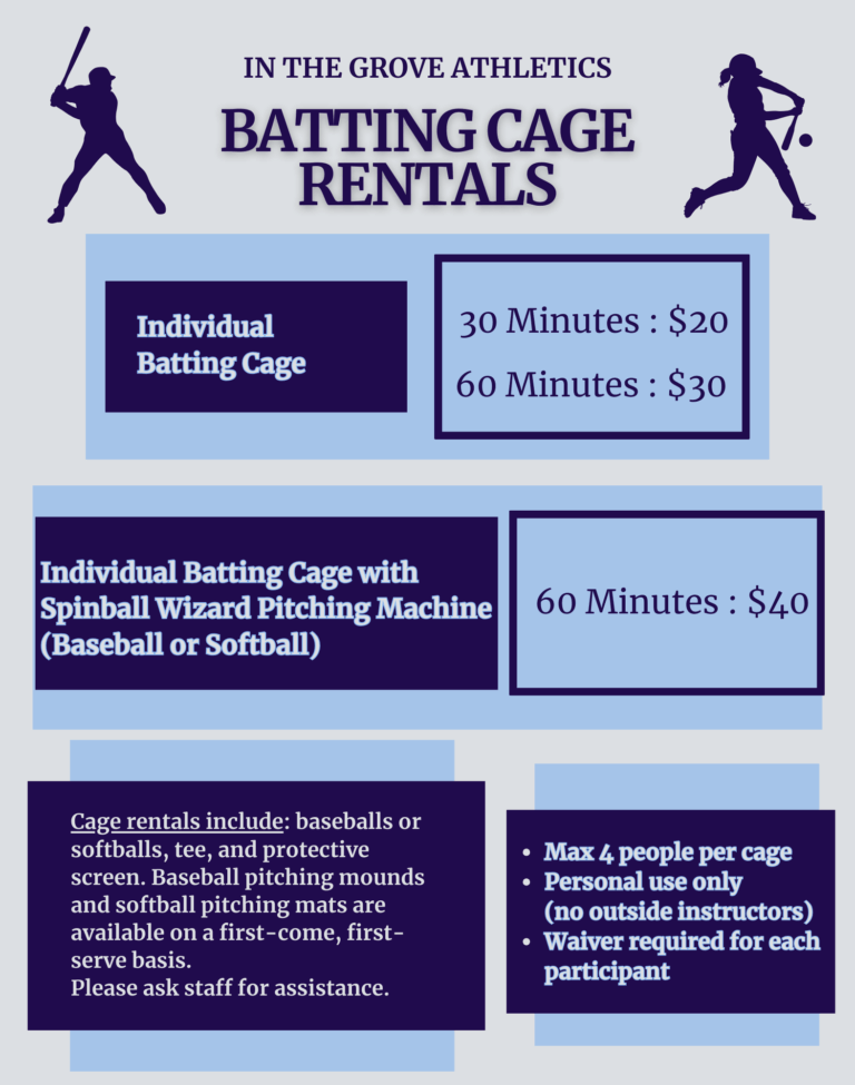 In The Grove Athletics offers rental options for individuals, teams, and organizations. The field and cages can be used for a variety of sports including baseball, softball, and soccer